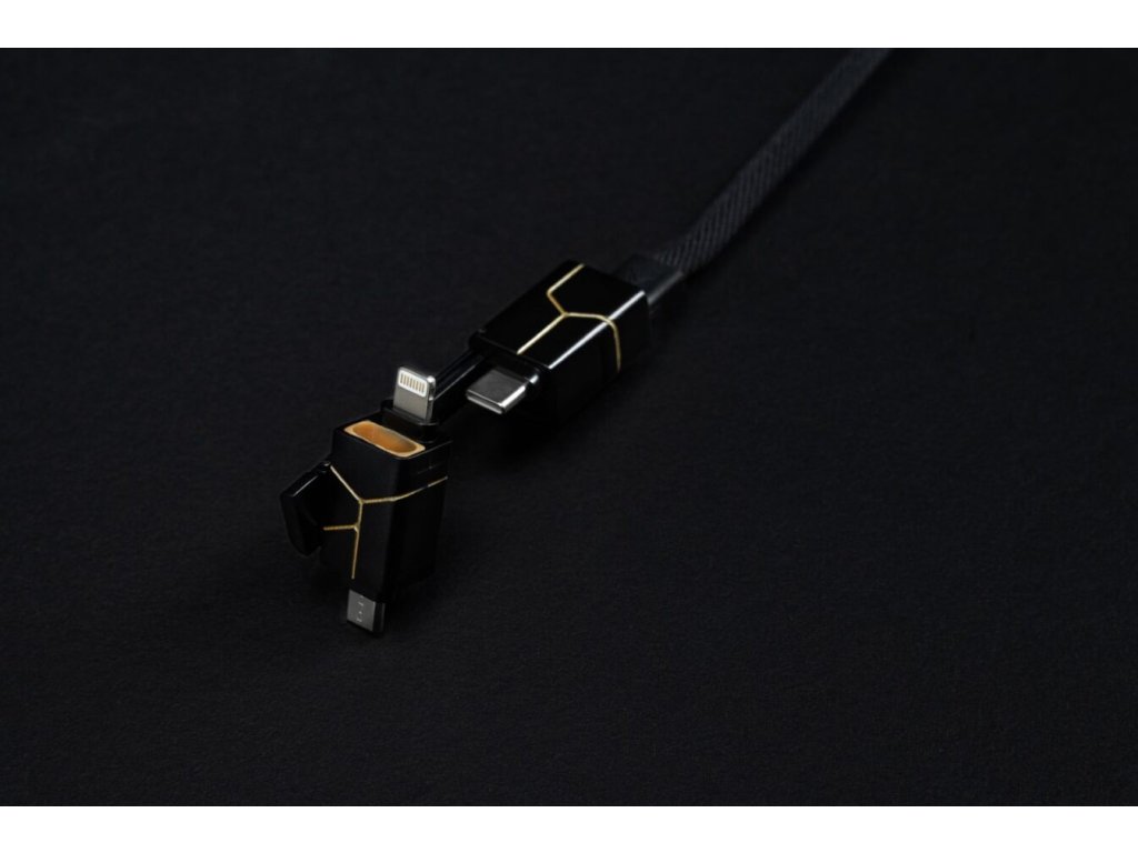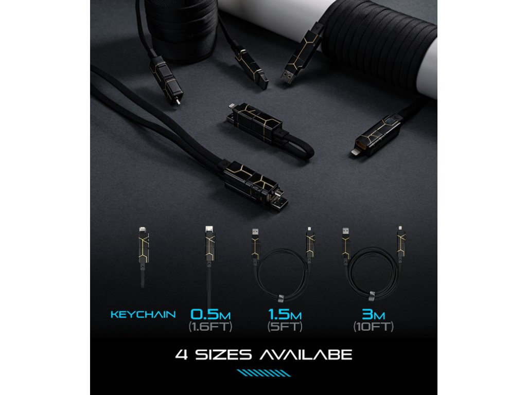 Zeus-X Go 6-v-1 je univerzální kabel, který poskytuje šest různých konektorů pro kompatibilitu s mnoha zařízeními, podporuje rychlé nabíjení a přenos dat.